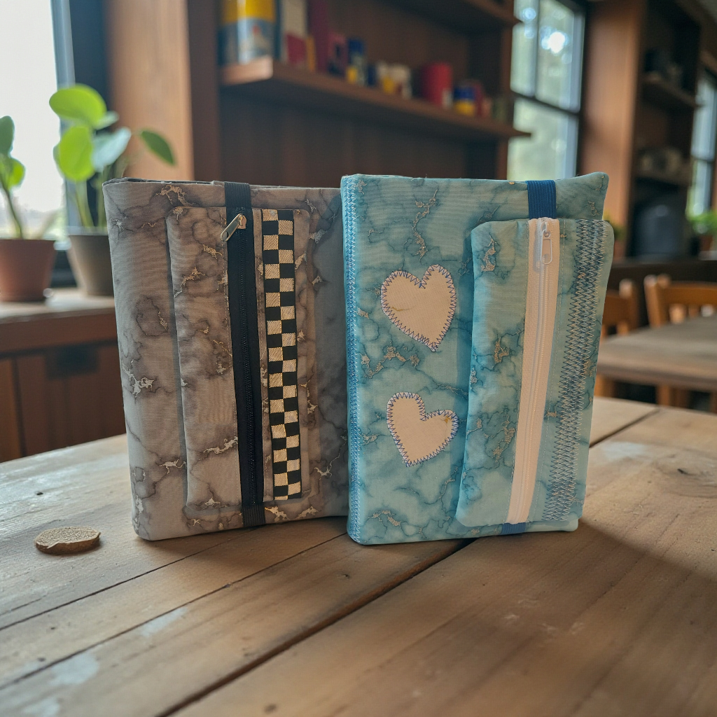 Ich bin immer noch mit dem Nähen von Buchhüllen beschäftigt…. Passend dazu Federtaschen .