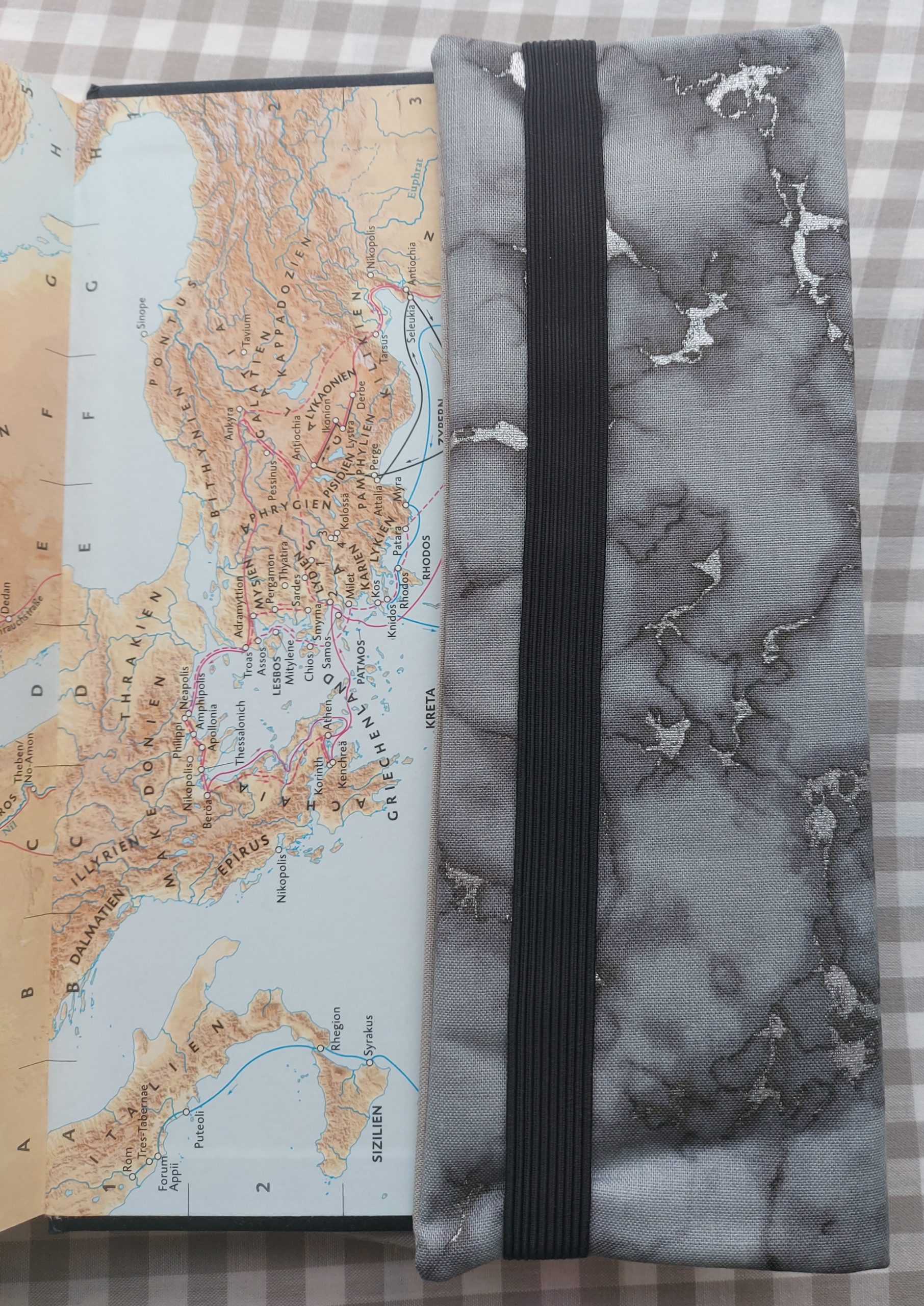 Welches Buch sich wohl hinter diesem Umschlag versteckt? Findet Nemo? Moby Dick? Oder etwas ganz anderes? Wie immer hat der Umschlag vorn eine Extratasche und ist hinten mit Gummi gearbeitet, damit er dickeren und dünneren Büchern dienen kann.