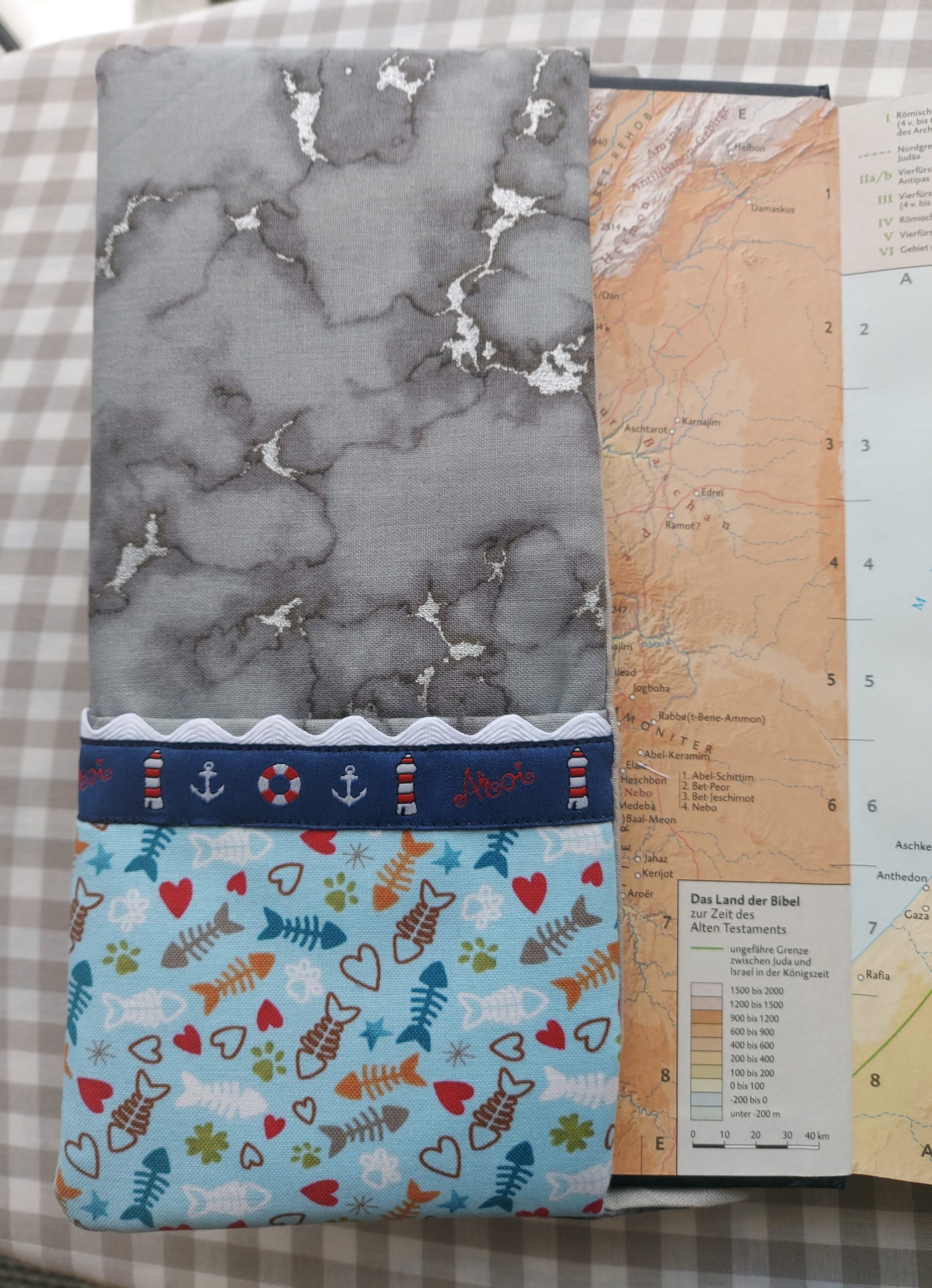 Welches Buch sich wohl hinter diesem Umschlag versteckt? Findet Nemo? Moby Dick? Oder etwas ganz anderes? Wie immer hat der Umschlag vorn eine Extratasche und ist hinten mit Gummi gearbeitet, damit er dickeren und dünneren Büchern dienen kann.