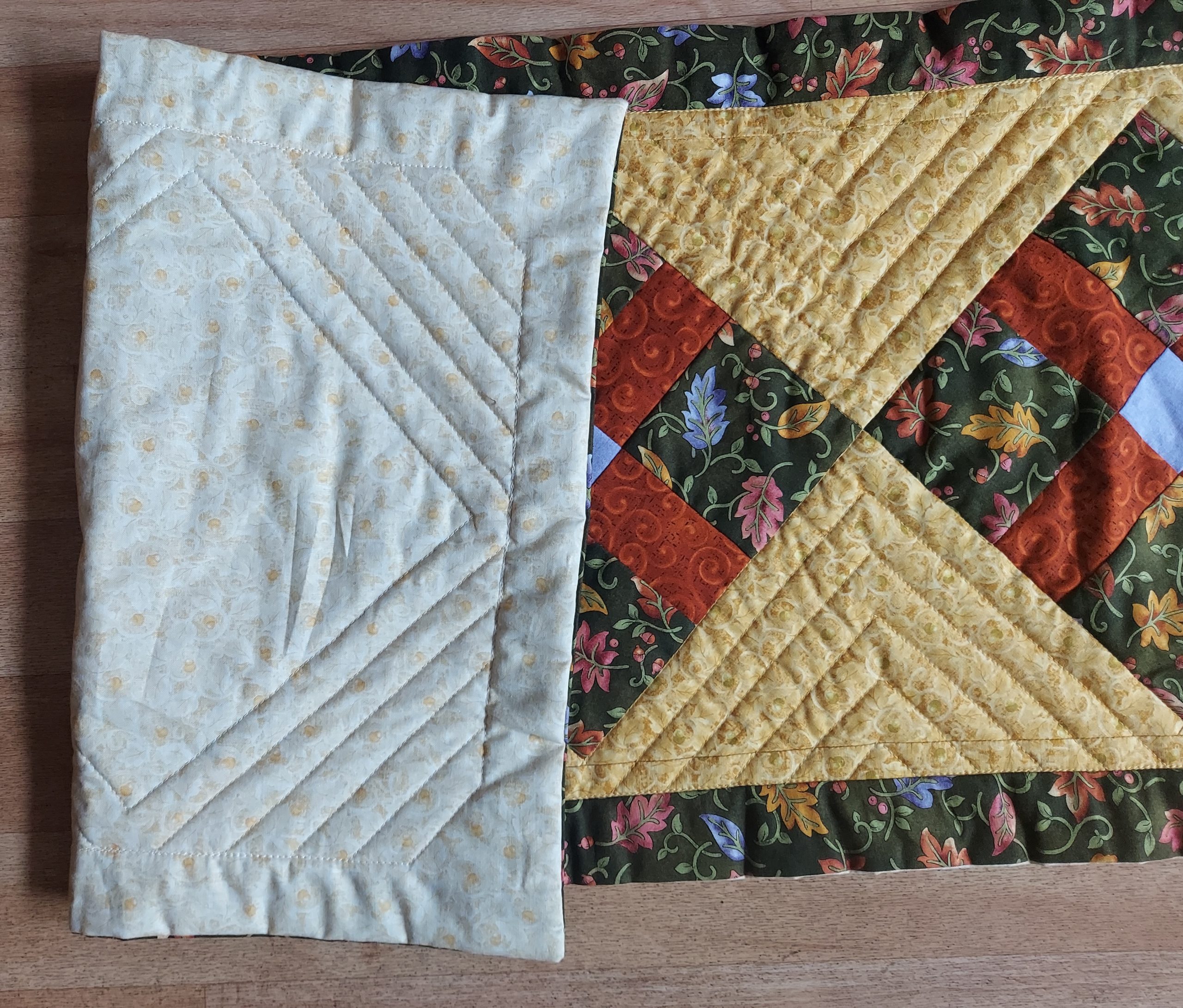 Heute gibt´s einen herbstlichen Tischläufer, 90 x 38 cm groß, mit Vlies gefüttert und bei 30° in der Maschine waschbar. Die Rückseite ist hellgelb. Alle Stoffe sind aus einer Kollektion. Diese Stoffe sind vergriffen.