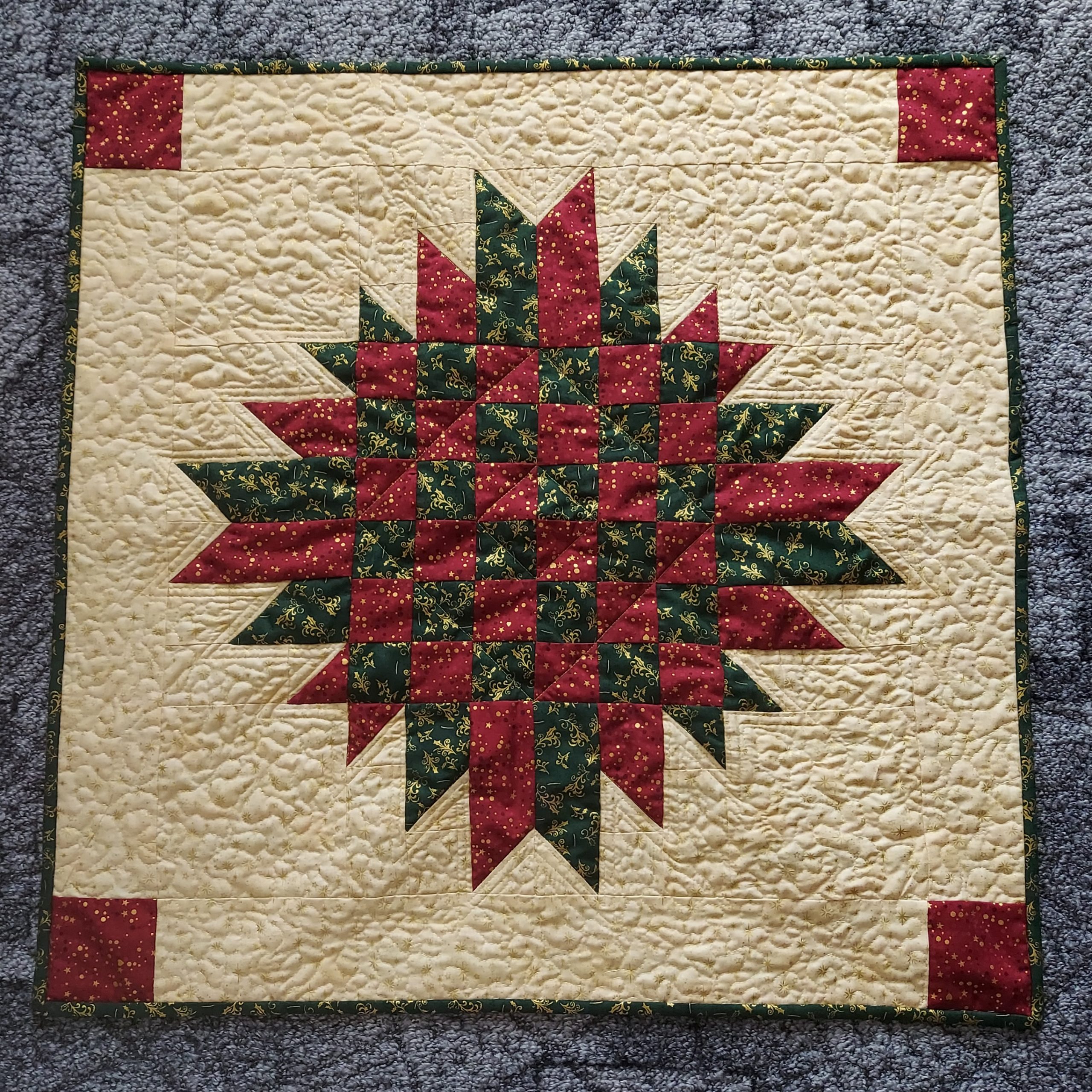Das Muster für diesen Stern habe ich auf Pinterest entdeckt. Also gerechnet und los ging´s mit Schnellschneide- und Nähtechnik. Es ist aber auch möglich, nur mit Resten zu arbeiten. Das probiere ich sicher noch aus, denn ich habe bereits zugeschnittene Reste.